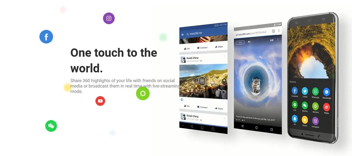 • Real-time 360 video/photo sharing on Facebook, YouTube, Twitter, WhatsApp, Messenger, WeChat