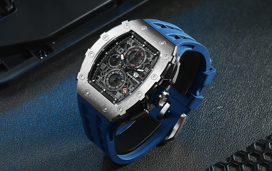 This men’s sports and leisure watch is equipped with a military-grade rubber strap with 12 ventilation holes to keep your skin ventilated at all times.